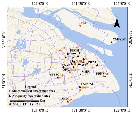 Distribution of meteorological and air quality observation stations (Source of the base map: http://xdc.at/map/wmts/, accessed on 18 May 2023).