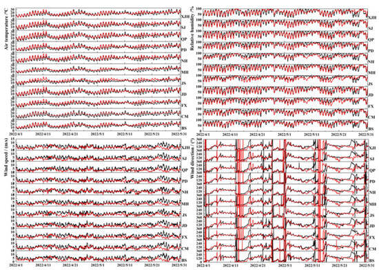 Time series comparison of temperature, relative humidity, and wind speed between simulated and observed values at various meteorological observation stations. (Red represents observed values and black represents simulated values).