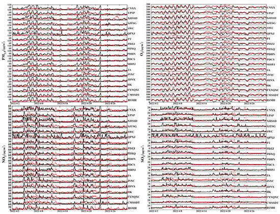 Time series of PM2.5, O3, NO2, and SO2 between simulated and measured values at observation stations (red represents observed values and black represents simulated values).