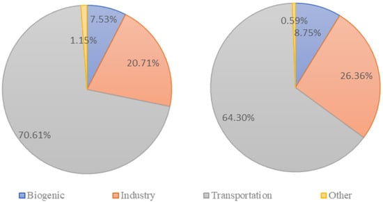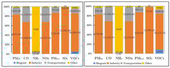 Due to the inherent uncontrollable nature of biogenic emissions, this study focuses only on the anthropogenic emission changes resulting from the pandemic lockdown measures. The biogenic emissions of VOCs remain unchanged at their original levels. In April–May 2021, the total anthropogenic emissions of major air pollutants (PM10, CO, NH3, NOx, PM2.5, SO2, VOCs) in Shanghai were as follows: 9.62 × 103, 1.38 × 105, 3.39 × 103, 5.81 × 104, 5.89 × 103, 2.36 × 104, and 9.99 × 104 (tons). In April–May 2022, the total anthropogenic emissions of major air pollutants (PM10, CO, NH3, NOx, PM2.5, SO2, VOCs) were as follows: 5.71 × 103, 8.07 × 104, 3.33 × 103, 3.40 × 104, 3.48 × 103, 1.40 × 104, and 6.05 × 104 (tons). The reduction percentages for each pollutant are as follows: 40.64% (PM10), 41.52% (CO), 1.77% (NH3), 41.48% (NOx), 40.92% (PM2.5), 40.68% (SO2), and 39.45% (VOCs). For each pollutant species, industrial sources show the largest decrease in emissions. The proportion of major pollutant emissions by each emission sector in the Shanghai during April–May 2021 and April–May 2022 is shown in the Figure 5.
