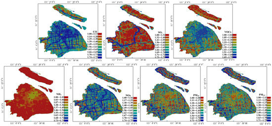 Spatial distribution of the ratio of total pollutant emissions in Shanghai between April–May 2021 and the same period in 2022 (by comparing the magnitudes of the ratios, the degree of emission reduction can be assessed, with colors ranging from red to blue indicating increasing levels of emission reduction).