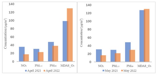 Monthly average concentrations of NO2, PM2.5, PM10, and MDA8_O3 in April and May of 2021 and 2022.