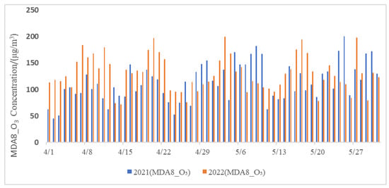 MDA8_O3 daily average concentrations from 1 April to 31 May in 2021 and 2022.