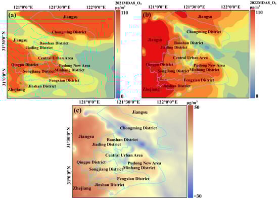 Monthly average concentration of MDA8 O3 during April and May of 2021 (a) and 2022 (b), and the difference in monthly average concentration of MDA8 O3 between April–May 2022 and the same period in 2021 (c).