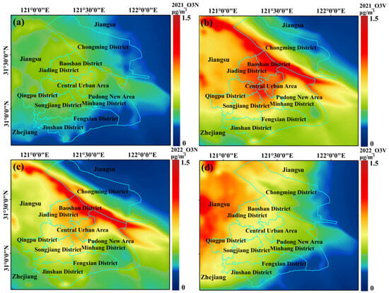 The rapid reduction in economic and social activities during the lockdown period has had some positive impacts on the environment, with a general improvement in air quality. Specifically, the concentration of NOx, one of the precursors to O3, significantly decreased; however, O3, as a typical secondary pollutant, exhibited a significant increase in most urban areas, especially in densely populated metropolitan regions with higher levels of human activity []. By comparing the PM2.5 and O3 monitoring data in Shanghai from 1 April to 31 May 2022, with the same period in 2021, it was found that the average concentration of PM2.5 in Shanghai decreased by 26.8% during this period. However, the maximum daily 8 h average (MDA8) concentration of O3 increased by 14.5%. This is consistent with previous research results, which showed a general improvement in air quality during the lockdown period, while the ozone concentration exhibited an increasing trend []. (Data source: Air Quality Online Monitoring and Analysis Platform https://www.aqistudy.cn, (accessed on 6 May 2023)).