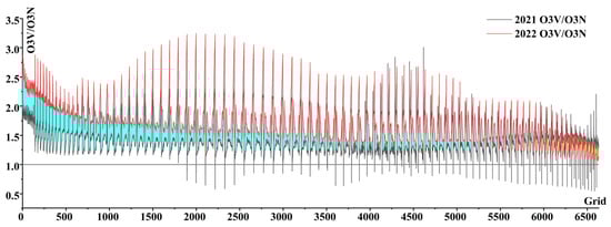Ozone formation regimes in Shanghai during April and May of 2021 and 2022 (the horizontal axis represents the number of grids in the Shanghai area within the simulated range, while the vertical axis represents the ratio of O3V to O3N in each selected grid area).