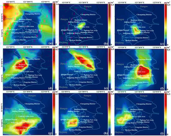 The regional contribution analysis of Shanghai includes nine regions: external areas (regions other than Shanghai), central urban areas (Huangpu District, Jing’an District, Xuhui District, Changning District, Yangpu District, Hongkou District, Putuo District), Minhang District, Baoshan District, Jiading District, Chongming District, Pudong New Area, Jinshan District, Fengxian District, Songjiang District, and Qingpu District. Figure 14 and Figure 15a–i represent the spatial distribution of regional contributions to Shanghai’s O3 concentration during the simulation period for these nine regions. From Figure 14 and Figure 15, it can be observed that different source regions exhibit significant spatial variations in their contributions to ozone concentration. In April–May 2021, the high-contribution regions of local sources to Shanghai’s O3 concentration were primarily concentrated in the southern part of Chongming District, the northern area of Pudong New Area, Jiading District, Baoshan District, western Fengxian District, and the northern and southern parts of Jinshan District. In April–May 2022, the high-contribution regions of local sources to Shanghai’s O3 concentration were mainly concentrated in most areas of Chongming Island, Jiading District, Baoshan District, Minhang District, and the northern and central parts of Pudong New Area. Within these high-contribution regions, the high-value area in Chongming District exhibited a belt-like distribution, while the other high-value areas showed a patchy distribution.