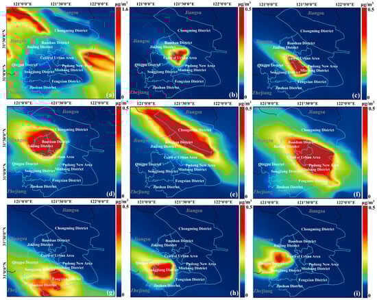 Contribution of regional sources to O3 pollution in Shanghai in April–May 2021 (a–i) represent External Transport (areas outside Shanghai), Central Urban Area (Huangpu District, Jing’an District, Xuhui District, Changning District, Yangpu District, Hongkou District, Putuo District), Minhang District, Baoshan District and Jiading District, Chongming District, Pudong New Area, Jinshan District and Fengxian District, Songjiang District, and Qingpu District).
