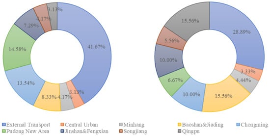 When PM2.5 emission contributions decrease, the concentrations of hydrogen peroxide radicals (HO2·) and nitrogen oxide radicals (NOx·≡NO+NO2) in the air increase. This leads to elevated levels of hydroxyl radicals (HOx·≡OH·+HO2·+RO2·) and nitrogen oxide radicals, promoting the catalytic oxidation of volatile organic compounds (VOCs) by NOx· and HOx·, resulting in the generation of O3 and its accumulation []. The Shanghai Environmental Monitoring Center [] divides the administrative divisions of Shanghai into three major regions based on the inner and outer ring roads: within the inner ring road, between the inner and outer ring roads, and outside the outer ring road. The area outside the outer ring road is the main region of pollutant emissions in Shanghai, with a contribution rate of 58.9% for PM2.5 emissions. During the lockdown period, there was a significant reduction in PM2.5 emissions outside the outer ring road, resulting in significantly higher O3 emission contributions in these four regions (Qingpu District, Chongming District, Baoshan District, and Jiading District) compared to the rest of the areas.