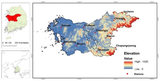 Chungcheong province in South Korea geographically lies between latitude 35°58′ N–36°00′ N and longitude 127°38′ E–125°32′ E in the west-central area of South Korea and on the east end of the Asian continent (Figure 1) []. The study area covers about 16,642 km2 with approximately 5.6 million inhabitants, which topographically consists of mountainous terrain in the east, a flatter and lower area in the west, and 65.7% of the total land area greater than 100 m above sea level [].