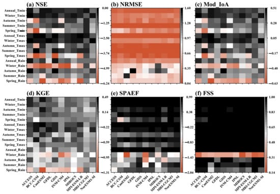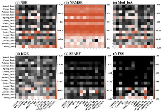 Spatial and temporal performance metrics for CMIP5 GCMs in simulating seasonal and annual climate during the historical period (1975–2005). Figures (a) NSE, (b) NRMSE, and (c) MoD_IoA represent the temporal indices of performance for Tmin, Tmax, and Rain. While figures (d) KGE, (e) SPAEF, and (f) represent the spatial indices of performance for Tmin, Tmax, and Rain.