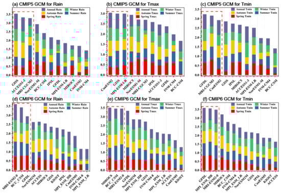 Comprehensive ranking of the CMIP5 and CMIP6 GCMs at seasonal and annual scales for the considered climate variables. The CMIP5 GCM for the Rain, Tmax, and Tmin are presented in (a), (b), and (c), respectively, with the red dashed line indicating the top three models. The CMIP6 GCM for the Rain, Tmax, and Tmin are presented in (d), (e), and (f), respectively, with the red dashed line indicating the top three models.