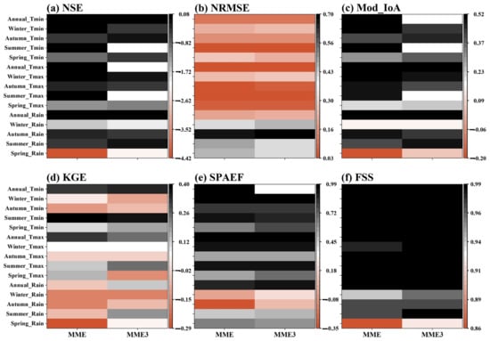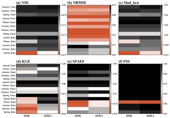Performance of CMIP5 MME datasets. Figures (a) NSE, (b) NRMSE, and (c) MoD_IoA represent the temporal indices of performance for Tmin, Tmax, and Rain. While figures (d) KGE, (e) SPAEF, and (f) represent the spatial indices of performance for Tmin, Tmax, and Rain.