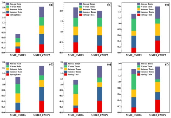 The results of the comprehensive ranking of the multi-model ensembles at seasonal and annual scales are shown in Figure 7. MME3 is ranked higher in all the climate conditions at seasonal and annual scales for both the CMIP5 and CMIP6 GCMs except for Tmax in CMIP5, where MME is ranked slightly higher than MME3 (Figure 7b). The high-performance rankings of spring Tmax and annual Tmax in MME influence the cumulative ranking over MME3, where the same climate conditions are ranked lower.