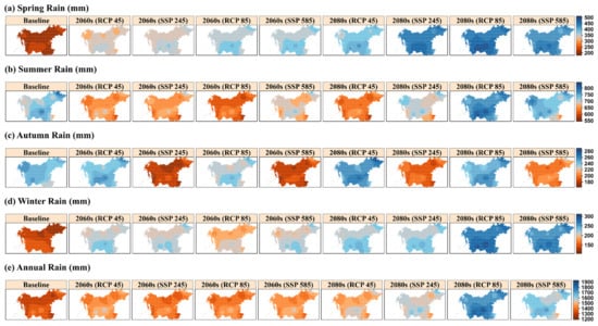 Understanding the future trends in rainfall and temperature is critical to prevent climate change-related impacts in an area. The seasonal and annual spatial changes in the average precipitation and temperature under four scenarios of RCPs and SSPs for future periods are compared to the baseline (Figure 8).