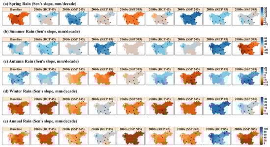 The irregularity in the trend pattern of precipitation is more demonstrated under the SSP scenarios. In spring, while the maximum significant increasing rate of rainfall is 25.67 mm/decade in the near future periods under SSP2-4.5, the SSP5-8.5 scenario exhibits a significant decreasing trend with an average value of 1.22 mm/decade (Figure 9a). Overall, the maximum significant change rate of 29.38 mm/decade for spring rain occurs under the SSP2-4.5 scenario in the 2080s. For summer rain, the SSP scenarios in the 2060s and 2080s exhibit decreasing trends, which become predominantly significant with intense magnitude (−48.63 mm/decade on average) under SSP5-8.5 during the far future period. Similarly, autumn precipitation under SSP2-4.5 and 585 in the 2060s and SSP2-4.5 in the 2080s exhibit consistent decreasing trends, which become significant mainly with a maximum average change rate of −12.36 mm/decade under SSP2-4.5 in the far future period. However, significantly increasing trends are expected to occur under the SSP5-8.5 scenario in the far future, with an average change rate of 19.00 mm/decade.