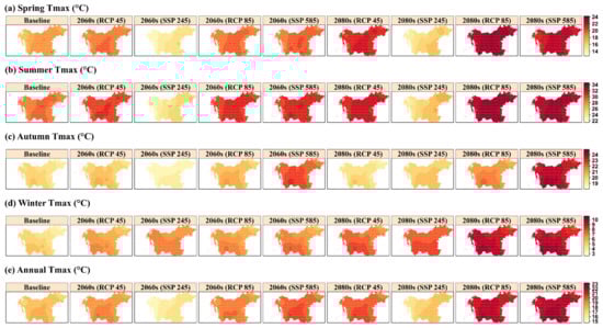 The highest occurring value of Tmax in the spring is 23.54 °C under RCP8.5 in the 2080s, while it decreases under SSP2-4.5 in the 2060s and 2080s to maximum values of 15.71 °C and 16.68 °C, respectively (Figure 10a). There is a moderate to high increase in the average Tmax from the 2060s to 2080s under RCP4.5. The distribution patterns of the highest and lowest occurring Tmax in spring are similar to the observations in the summer under the same RCP8.5 and SSP2-4.5 scenarios in the 2080s and 2060s, respectively. In autumn, however, the significant increase in Tmax only occurs under SSP5-8.5 scenarios during both the near and far future with values of 23.05 °C and 24.50 °C, respectively (Figure 10c). Similar to other seasons and annual averages, the lowest Tmax with a maximum value of 19.18 °C occurs in the 2060s under the SSP2-4.5 scenario.