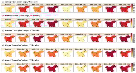 As shown in Figure 11, the seasonal and annual Tmax trends indicate significant statistical changes during the historical and future periods of both near (2060s) and far (2080s) under the RCP and SSP scenarios. In the spring, the maximum changes in Tmax occur under the RCP8.5 scenario in the 2060s at a significant rate of 0.72–0.77 °C/decade (Figure 11a), which is also the maximum expected change in Tmax in both the near and far future under all RCP and SSP scenarios across seasons and the annual scale (Figure 11). However, the lowest changes in spring Tmax occur during the 2060s under SSPs 585 at a significant rate of 0.06 °C/decade. The rate of change significantly decreases from the near to the far future under RCP4.5, RCP8.5, and SSP2-4.5 at an average of 0.75 to 0.45 °C/decade, 0.94 to 0.91 °C/decade, and 0.52 to 0.37 °C/decade, respectively, while only under SSP5-8.5 is an increase in Tmax expected from the 2060s to 2080s at an average rate of 0.06 °C/decade to 0.78 °C/decade, respectively.