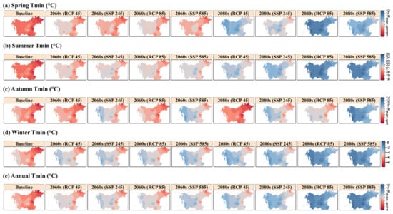 In the autumn, the distribution of Tmin follows similar patterns across the seasons and annually and for different scenarios, such that Tmin increases from the northeast end to the west region (Figure 12c). While a maximum Tmin of 13.57 °C occurs around the west area under SSP5-8.5 in the 2080s, the minimum Tmin is 5.53 °C and occurs at the northeast end under RCP4.5 in the 2080s. Winter is expected to progressively increase in Tmin during the near and future periods under the RCP and SSP scenarios (Figure 12d). However, the northeast region shows a low to moderate increase for all RCP and SSP scenarios in the 2060s and 2080s, except for RCP8.5 and SSP5-8.5, which show a considerable increase in Tmin. The average Tmin reaches up to −0.19 °C and 0.05 °C in the west region under the RCP8.5 and SSP5-8.5 scenarios, respectively, in the 2080s, while the lowest Tmin is −7.72 °C, which occurs around the northeast end under RCP4.5 in the 2060s (Figure 12d). Lastly, the annual Tmin also has a progressive distribution pattern, such that under RCP4.5 and SSP2-4.5, the average Tmin moderately increases from 7.70 and 8.01 °C in the 2060s to 8.55 and 8.99 °C in the 2080s, respectively (Figure 12e). However, under RCP8.5 and SSP5-8.5, it intensely increases from 7.85 and 8.34 °C in the 2060s to 10.30 and 10.53 °C in the 2080s, respectively.