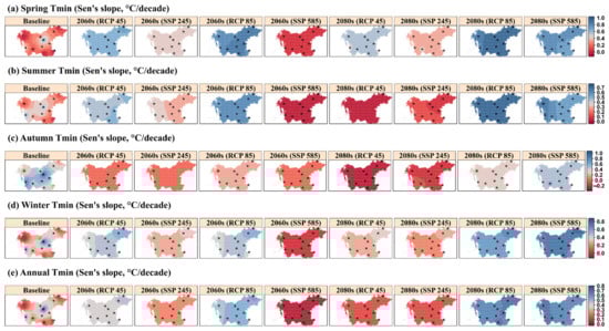 As shown in Figure 13, the trends in seasonal and annual Tmin indicate statistically significant changes during the historical and future periods in both the near and far future under the RCP and SSP scenarios. In the spring, the trend in Tmin significantly increases at an average maximum rate of 0.91 °C/decade under the RCP8.5 scenario in the 2080s, while a decreasing trend rate of 0.05 °C/decade occurs under the SSP5-8.5 scenario in the 2060s (Figure 13a). While the trend moderately decreases under RCP4.5 and SSP2-4.5 from the 2060s and 2080s at an average of 0.65 to 0.54 °C/decade and 0.42 to 0.36 °C/decade, respectively, the trend significantly increases at an average rate of 0.05 to 0.75 °C/decade under SSP5-8.5 scenario in the near and far future, respectively.