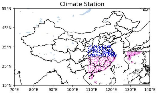 In this paper, winter refers to October to March; for example, the winter in 1995/1996 is denoted as 1995/1996. The JRA55 reanalysis data of the Japan Meteorological Agency were used. These data are global daily average grid data with a horizontal resolution of 1.25° × 1.25° and a temporal range of 1960/1961–2019/2020. The sea-level pressure field, 850 hPa zonal wind field, and meridional wind field were selected. Other meteorological datasets included NOAA’s OLR data with a range of 1979/1980–2019/2020 and the daily dataset of meteorological elements of national ground weather stations from 1960/1961 to 2019/2020 in southern China (latitude below 36° N and longitude below 108° E) (Figure 1). Following Chen et al. [], the research area was divided into an area north of the Yangtze River (blue dots in Figure 1) and another south of the Yangtze River (pink dots in Figure 1), with a dividing line at 30° N. Since the OLR data started in 1979, our prediction test was conducted for the data within the range of 1979/1980–2019/2020. First, 10 years out of 31 years (1979/1980–2009/2010) were randomly selected as the validation set, the remaining 21 years represented the training set, and 2010/2011–2019/2020 was the test set (1670 d).