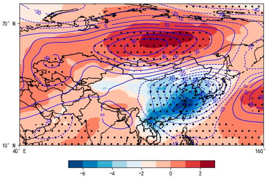 Composite of temperature anomalies in 850 hPa (colors, unit: °C) and geopotential height anomalies in the 500 hPa (contours, unit: gpm) of RPECEs (the dots indicate that the relationship does not exceed the 0.05 significance level).