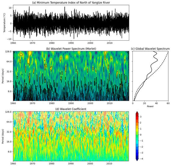 Minimum temperature index (a), Morlet wavelet power spectrum (b), global wavelet spectrum (c), and wavelet coefficient (d) from 1960 to 2020 in the northern Yangtze River region.