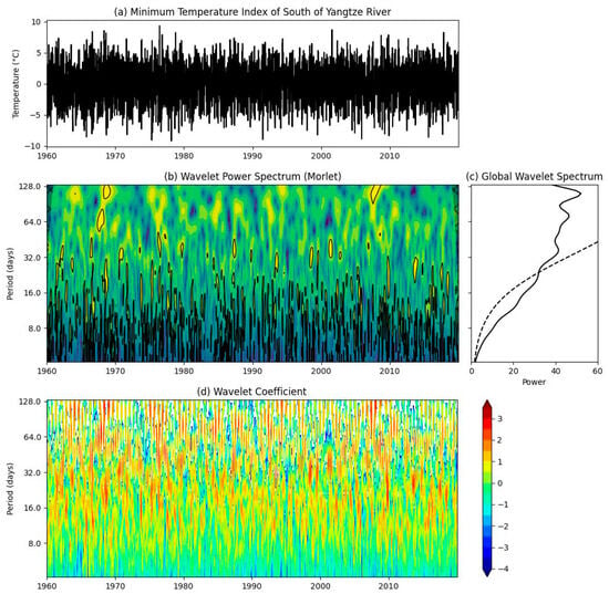 Minimum temperature index (a), Morlet wavelet power spectrum (b), global wavelet spectrum (c), and wavelet coefficient (d) from 1960 to 2020 in the southern Yangtze River region.