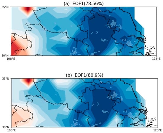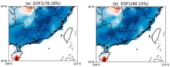 After removing the annual cycle and annual average from the daily minimum temperature series from 1995 to 2020, the Butterworth filtering of the low-frequency oscillation series was conducted after station-by-station filtering for 10–20 d and 30–60 d. EOF decomposition was performed on the low-frequency oscillation series at multiple stations. As shown in Figure 6, the explained variances of the first mode of the minimum temperature on the two time scales (10–20 d and 30–60 d) for the northern Yangtze River region were 78.9% and 80%, respectively. The physical meaning of the first mode is that the northern region experienced uniform cold conditions. The time coefficient represents the degree of coldness, and the higher the positive phase, the greater the degree of coldness in this region. Similarly, Figure 7 shows the explained variance for the southern Yangtze River region (79%). The time coefficient indicates uniform coldness.