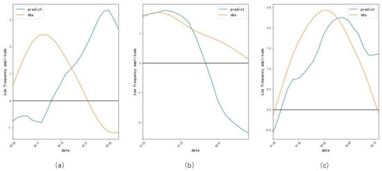 As shown in Figure 9, three of the four events were correctly predicted. Similar trends were observed for the predicted and observed values. The prediction for the period in Figure 9a exhibits a phase deviation. Two criteria were used to assess the prediction accuracy:
