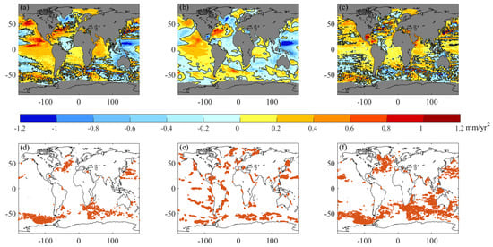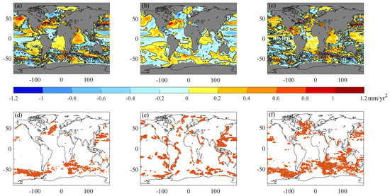 Acceleration (mm·yr−2) from satellite altimetry (a); IAP (b) and their difference (c) after removing the internal variability for 1993–2020. Statistical significance test of the estimates of acceleration for (d) satellite altimetry, (e) IAP steric, and (f) the difference between estimates from satellite altimetry and IAP steric after removing the internal variability.