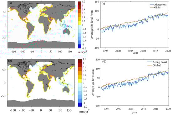 Acceleration calculated using satellite altimetry data close to coastline (a). Global mean sea level time series from 1993–2020 are represented by the red line, and global near-coastal mean sea level is represented by blue, calculated from satellite altimetry values close to the coastline (b). Acceleration close to the coastline after removing the internal variability (c). Global mean sea level time series after removing the internal variability are represented by the red line, and global near-coastal mean sea level after removing the internal variability is represented by blue (d).