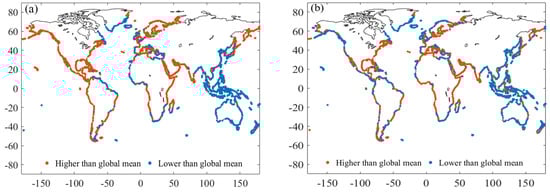 Near-coastal locations with acceleration exceeding the global estimate (brown) and below the global estimate (blue) (a). Near-coastal locations with acceleration exceeding the global estimate (brown) and below the global estimate (blue) after removing the internal variability (b).
