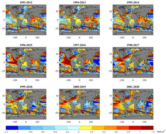 Evolution of the satellite altimetry patterns of acceleration for moving 20-year time window by one year since 1993.