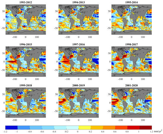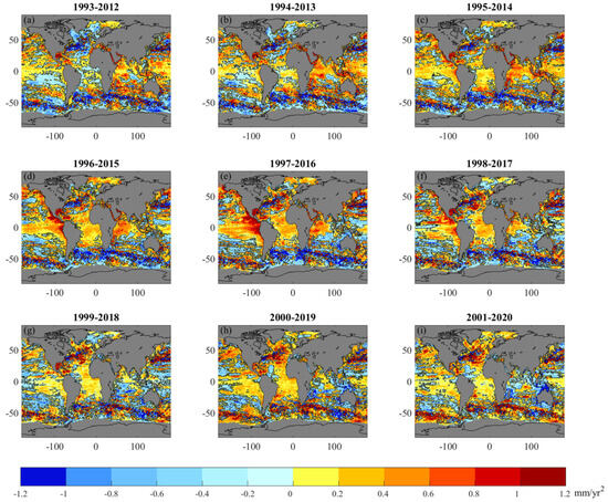 Evolution of the steric sea level patterns of acceleration for moving 20-year time window by one year since 1993.