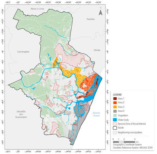 Location map of the city of Recife highlighting “Area 1” composed of the districts of Recife, Sao Jose and Santo Antonio; “Area 2” with the districts of Boa Vista and Santo Amaro; “Area 3” with the districts subjected to the Twelve Neighborhood Law and “Area 4” with the districts of Boa Viagem and Pina. Along with water bodies, vegetation, and neighboring municipalities.