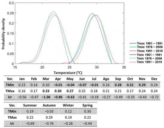 Diagram of the maximum (continuous) and minimum (dotted) temperature probability density function for the decades: 1961 to 1991 (blue lines), 1976 to 2006 (green lines) and 1991 to 2019 (red lines) in Recife and the tables of monthly and seasonal decadal rates of temperatures and humidity in Recife. Source: Adapted from [34].