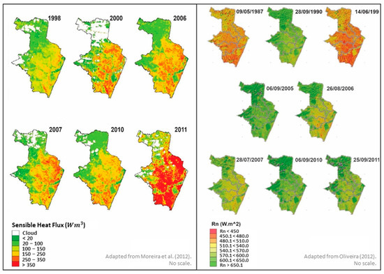 Spatial distribution of sensible heat flux (on the left side) in the years 1998, 2000, 2006, 2007, 2010, and 2011 (a) and surface radiation balance (on the right side) in the years 1987, 1990, 1991, 2005, 2006, 2007, 2010, and 2011 in Recife (b). Source: Adapted from [40,41].