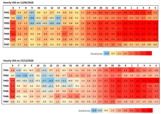The urban heat island (UHI) effect was analyzed using seven thermo-hygrometers placed in distinct landscape settings in the year 2018 [42]. These authors identified two representative days for the UHI analysis during the study year (Figure 4). One was 12 June 2012, corresponding to the rainy season, and the other was December 27, for the dry season. As the UHI phenomenon is primarily nocturnal, it was shown that during both periods, the highest UHI intensities in Recife occurred after sunset, specially between 2:00 and 3:00 a.m.