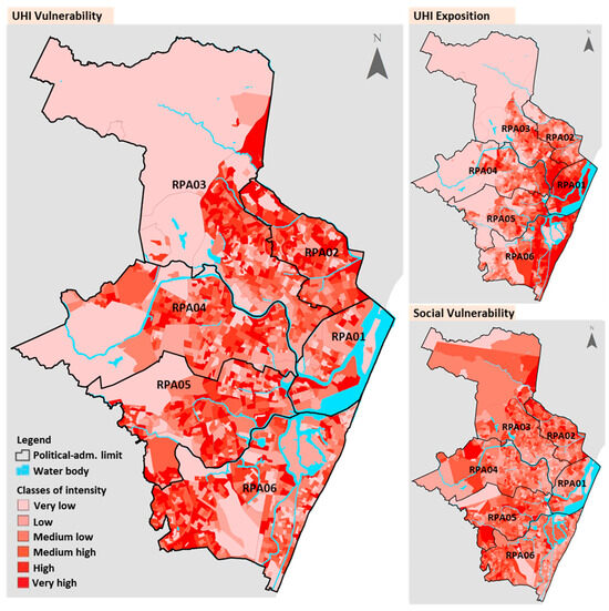 Maps of UHI vulnerability, UHI exposition and social vulnerability in Recife. Source: Adapted from [14].