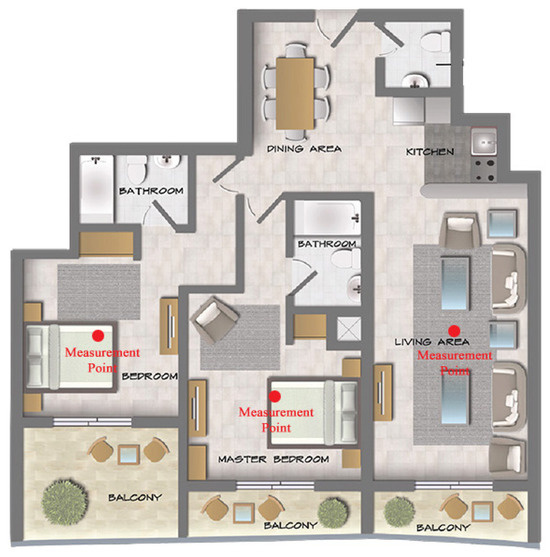 The measurement locations were, specifically, the bedrooms and living rooms of 2-bedroom units (145.4 m2) situated on floors 11 to 15, primarily targeting the middle floors of the building (Figure 2). The measurements encompassed assessing HCHO and VOC levels in the indoor air (Figure 3) [63]. To analyze the influence of external factors such as ventilation, temperature, humidity, and air circulation on these substances, meteorological conditions, both indoors and outdoors, were measured twice daily at 10:00 a.m. and 6:00 p.m. over three weeks at the designated measurement site [64].