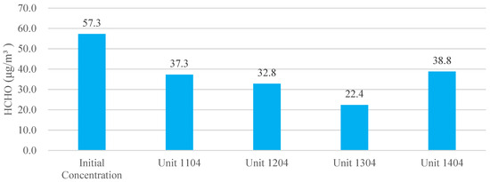Based on the measurements conducted for HCHO in the living room, as depicted in Figure 5, the initial concentration immediately after construction was recorded at 57.33 μg/m3. Following three weeks of ventilation using different methods, the HCHO concentrations observed were 37.3 μg/m3 (1104), 32.8 μg/m3 (1204), 22.4 μg/m3 (1304), and 38.9 μg/m3 (1404). Notably, the most significant reduction in HCHO levels was observed in case 1204, where the kitchen hood fan was operated in the living room, and in case 1304, where both the kitchen hood fan and bathroom exhaust fan were operated simultaneously.