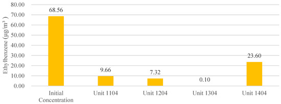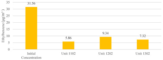After conducting measurements in the bedroom of a newly constructed apartment, the concentrations of benzene, ethylbenzene, and styrene were determined. As indicated in Table 7, the initial concentrations immediately after construction were recorded at 1.5 μg/m3, 31.56 μg/m3, and 2.21 μg/m3, respectively. Notably, benzene exhibited a concentration of 360 μg/m3, while styrene exhibited a concentration of 300 μg/m3, both of which were significantly lower in comparison.