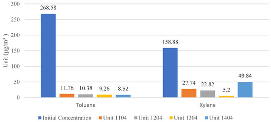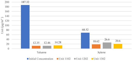 Moving on to the living room, measurements of toluene and xylene were conducted, as illustrated in Figure 9. The initial concentrations immediately after construction were 268.59 μg/m3 and 158.89 μg/m3, respectively. Although these concentrations were 1.4 times higher than those observed in the bedroom, they fell below the WHO recommended standard values of 1000 μg/m3 for toluene and 700 μg/m3 for xylene.
