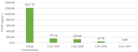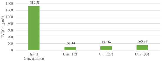 After conducting measurements of TVOC in the bedroom and living room of the newly constructed apartment, it was observed that the initial concentrations immediately after construction were 1319.58 μg/m3 and 1217.73 μg/m3, respectively, indicating relatively high levels.