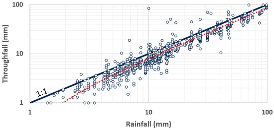The relationship between rainfall and throughfall for 96 pairs of samples collected at the RF + TF monitoring site (854 individual collector measurements are shown; this is more data than the EPC concentrations were determined on). Mean throughfall is estimated as 0.80 ± 0.3 of rainfall. Based on the linear model shown in the figure (dotted line), throughfall depth is 0.75 the rainfall depth; median event throughfall was 0.77.