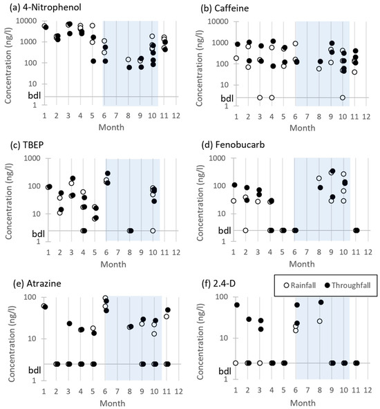 Comparison of EPC concentrations for rainfall and throughfall paired samples. The below detection limit (bdl) value is set manually at 2.5 ng/L for visualization. The six main EPCs are shown in panels (a) 4-nitrophenol; (b) caffeine; (c) TBEP; (d) Fenobucarb; (e) Atrazine; and (f) 2,4-D. Month 1 is January; 6 is June; etc. Pairs are offset slightly to preserve visibility. Duplicate values for bdl are not visible. There are no paired data for month 7. Shading highlights the wet period.
