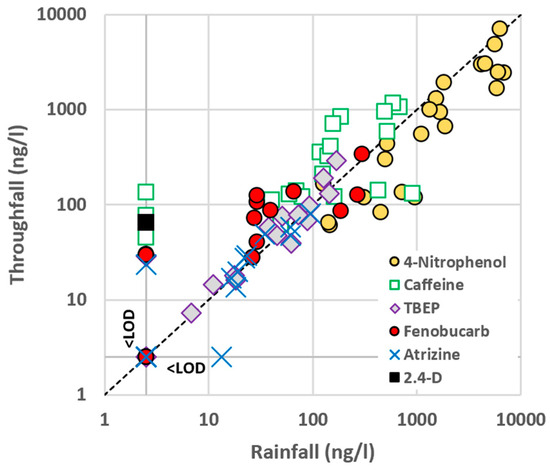 Comparison of rainfall versus throughfall concentration for the six more prevalent EPCs studied; 4-nitrophenol was systematically higher in rainfall than throughfall. Values below detection limit (bdl) are plotted at 2.5 ng/L for visibility.