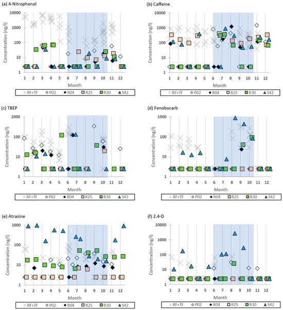 Comparison of EPC concentrations in two ponds (P02, P30), two reservoirs (R04, R25), one stream (S25), and 44 combined rainfall and throughfall samples. June (month 6) combines data from 2021 and 2022. Values below detection limit (bdl) are plotted at ~2.5 ng/L for visibility. Data for R59 and R60 are not shown. The six main EPCs are shown in panels (a) 4-nitrophenol; (b) caffeine; (c) TBEP; (d) Fenobucarb; (e) Atrazine; and (f) 2,4-D. Dry deposition and rainfall-only samples are included in the graph (these data are listed in Supplement item S2). Month 1 is January; 6 is June, etc. Shading highlights the wet period.