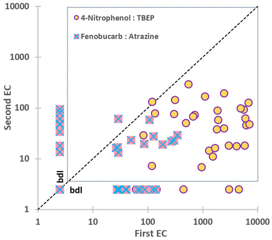 Regarding transport, the patterns depicted in Figure 6 do not align with the hypothesis that the listed pairs of compounds are transported in a similar manner. Each pair of compounds belongs to distinct categories, encompassing industrial (4-nitrophenol, TBEP) and agricultural (fenobucarb, atrazine) compounds. If these compounds were primarily transported through a common medium like rainfall or surface runoff, we would anticipate less variability within each pair, factoring in considerations like degradation and transformation. Put more simply, we would not expect a greater association between levels of concentration unless application rates varied, for example, in the case of the two pesticides. Although the groupings for the agricultural pair exhibited a relatively tighter pattern than the industrial pair, the presence of numerous values below the detection limit contributes to high variability.
